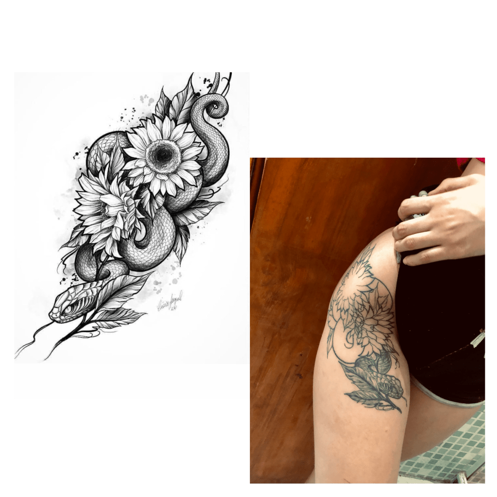 Meu namorado é meu tatuador e essa foi minha terceira tatuagem, mas é a primeira realmente grande que eu faço. Ainda não finalizamos, porque eu odeio ficar sentindo dor durante muito tempo e acabo me estressando depois de algumas horas tatuando, e aí tenho que fazer em várias sessões. Pretendo finalizar ainda esse ano, mas veremos.