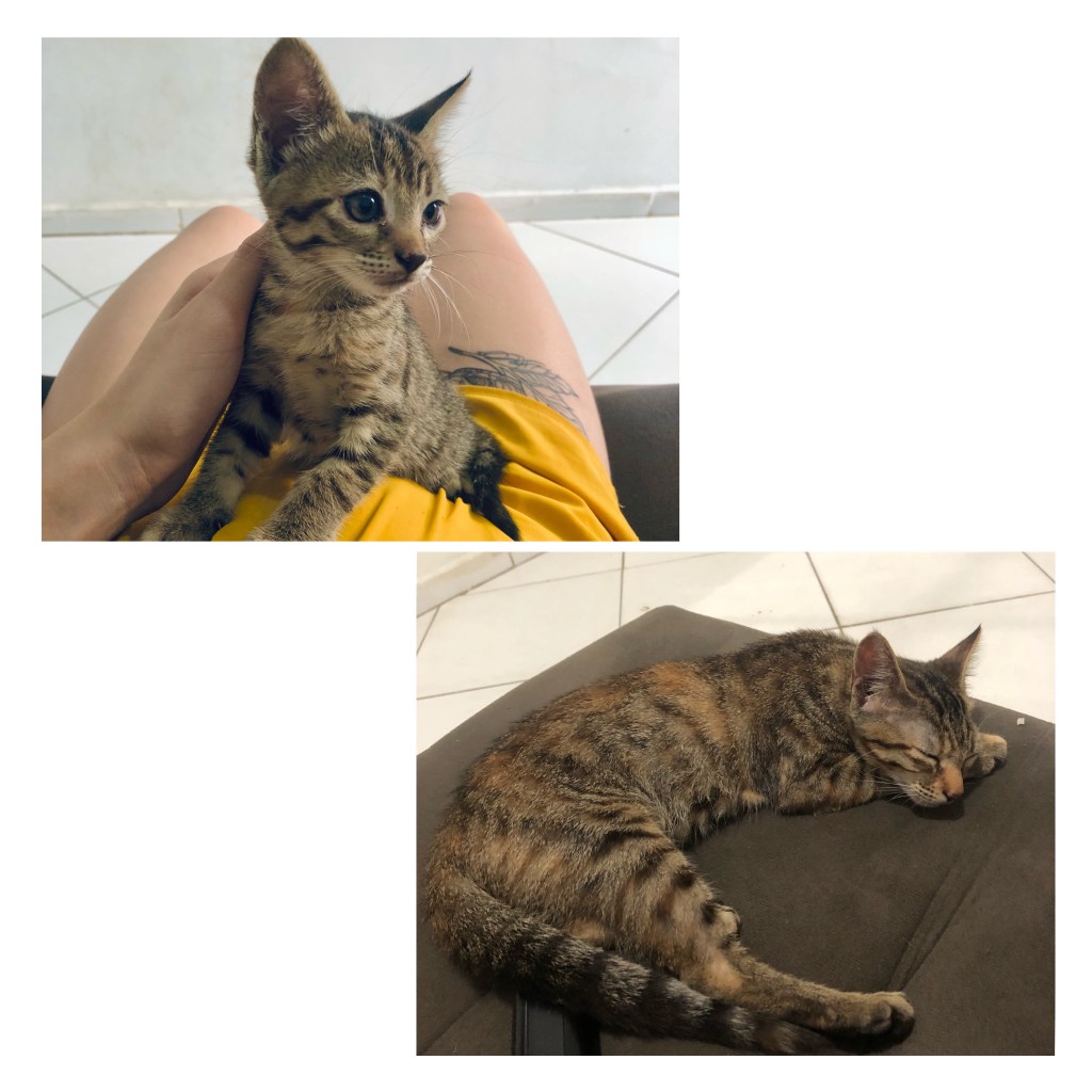 Encontrei a Agnes em um grupo do Facebook de adoção, de Gatos e Cachorros. Ela não estava em nenhuma publicação principal e sim nos comentários, e quando vi aquela carinha de neném tão fofa, sabia que precisava dela, ela já tinha 2 meses.