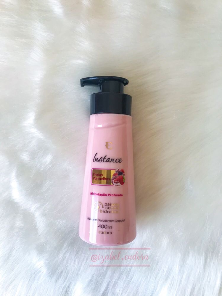 O primeiro é o de frutas vermelha, da linha Instance da Eudora, na minha opinião ele é a combinação perfeita de hidratação e cheirinho delicioso, o que é algo bem difícil de encontrar. Eu já tinha experimentado outro da linha, mas achei ele mais aquoso e não tão hidratante, mas esse de frutas vermelhas tem uma textura mais grossinha e depois que você passa na pele, sente que ela suga.