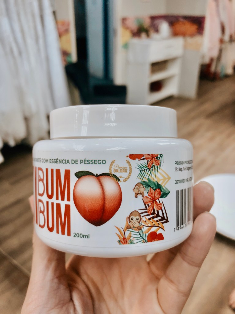 A embalagem do Kibumbum é bem tropical, tem o desenho de um pêssego que logo associamos ao bumbum, mas também está associado ao seu cheiro, um cheirinho bem gostoso e nada enjoativo de pêssego, que dispensa qualquer hidrante, uma delícia.